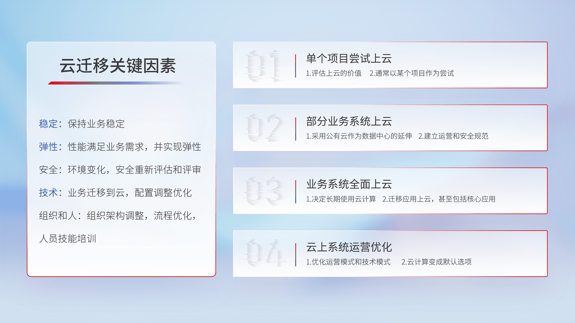 结合实际业务,,,,从规划设计、、、云平台选型、、云原生改造、、、数据迁移、、、集成交付,,,迁移全过程为客户识别最佳上云路径,,,,做好风险识别管理,,,,设计网络架构、、、身份权限、、安全审计合规、、、、操作审计、、日志审计、、、监控告警策略、、、多站点容灾设计等,,,对云上基础设施进行整体规划,,提升IT治理水平,,,,以满足弹性、、、、高可用、、高性能的需求。。