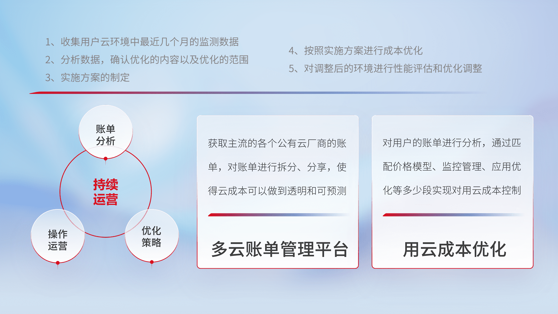 通过多云纳管,,,,以统一的资源数据模型把客户的云资源进行抽象和封装,,进而实现对多云资源的统一操作,,,保障云资源管理的可靠性、、、、稳定性与可用性。。量身定制化运维内容,,,,配置、、、开发运维、、、、补丁管理、、、、备份、、、、监控、、、、认证和访问管理、、、、审计和日常巡检等,,,保障在用云过程中的可靠度,,,,稳定度以及高可用率。。。